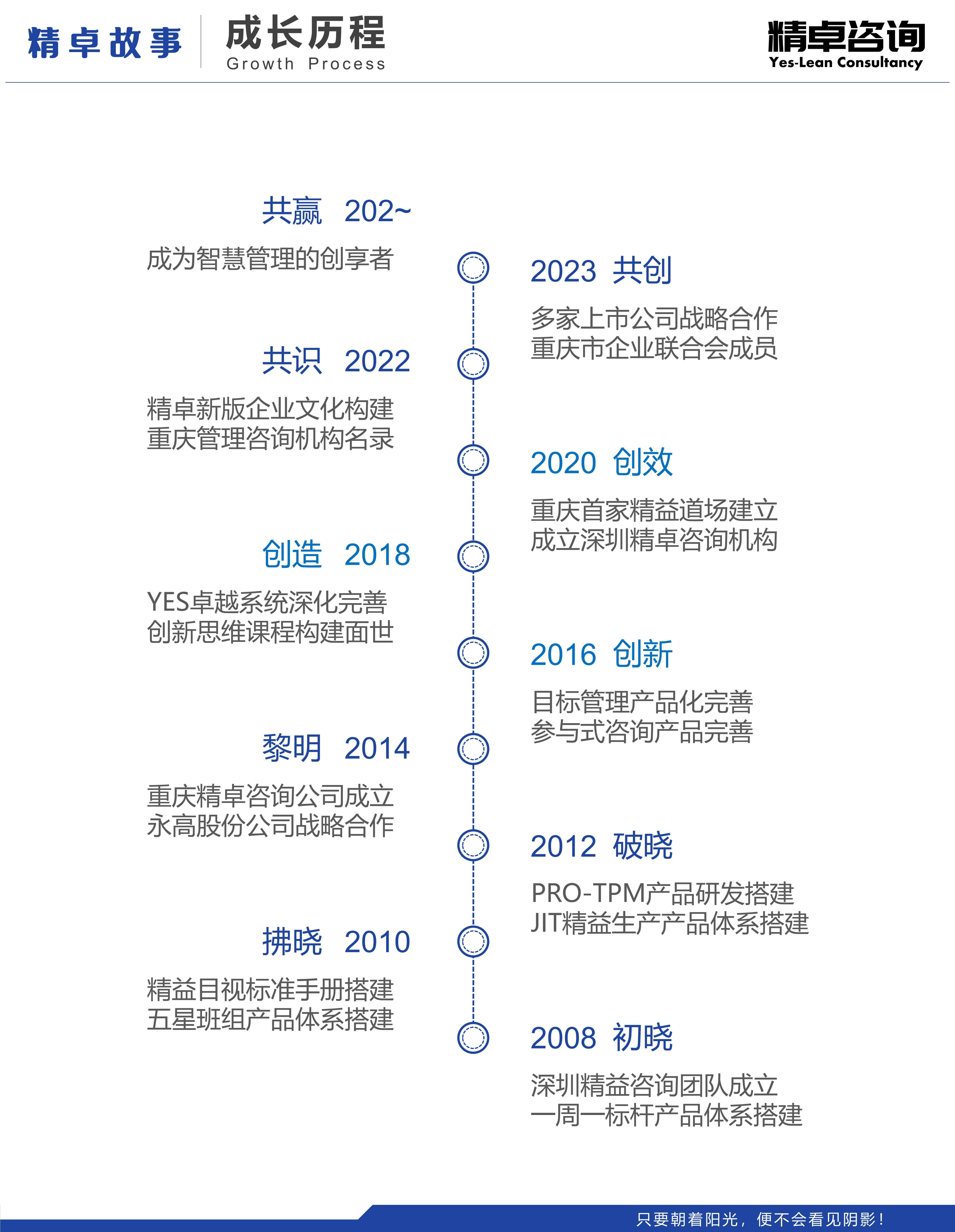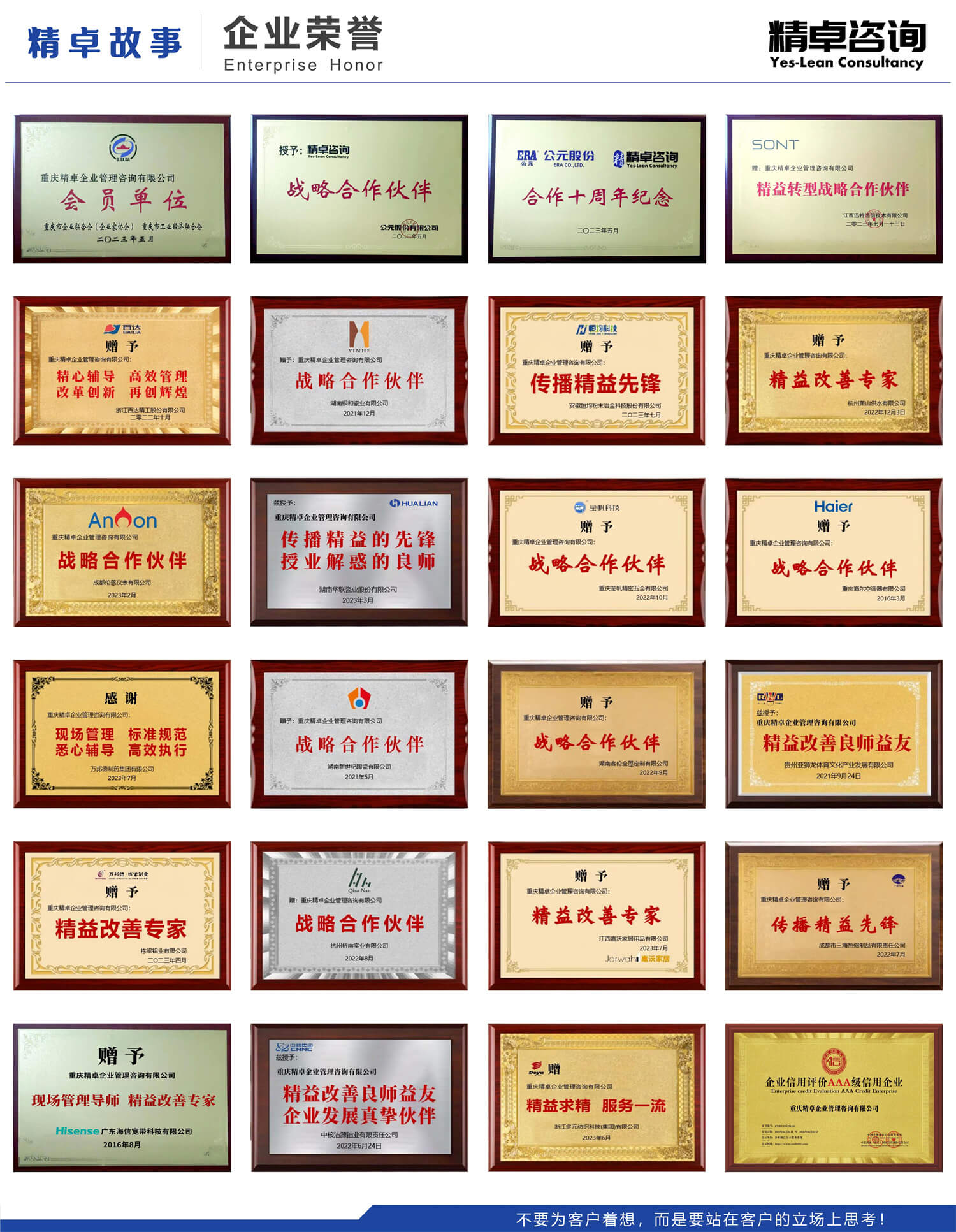 精卓咨詢通過專業(yè)、完善的產(chǎn)品與服務(wù),已為中國數(shù)百家制造企業(yè)提供了咨詢服務(wù),行業(yè)涉及汽車產(chǎn)業(yè)、電子通信、家用電器及電氣設(shè)備、食品飲料、醫(yī)藥化工及醫(yī)療器械、機械設(shè)備、快速消費品、新能源等各領(lǐng)域的標(biāo)桿企業(yè),來自各行各業(yè)的企業(yè)案例素材,是我們進行實務(wù)咨詢的智慧寶庫。精卓咨詢擁有內(nèi)部研發(fā)體系,在此過程中獨立開發(fā)YES運營系統(tǒng)(已導(dǎo)入標(biāo)桿客戶:永高股份 上市代碼:002641),五星班組體系,YES-TPM體系,555現(xiàn)場維持活動等適用于中國企業(yè)的管理方法。