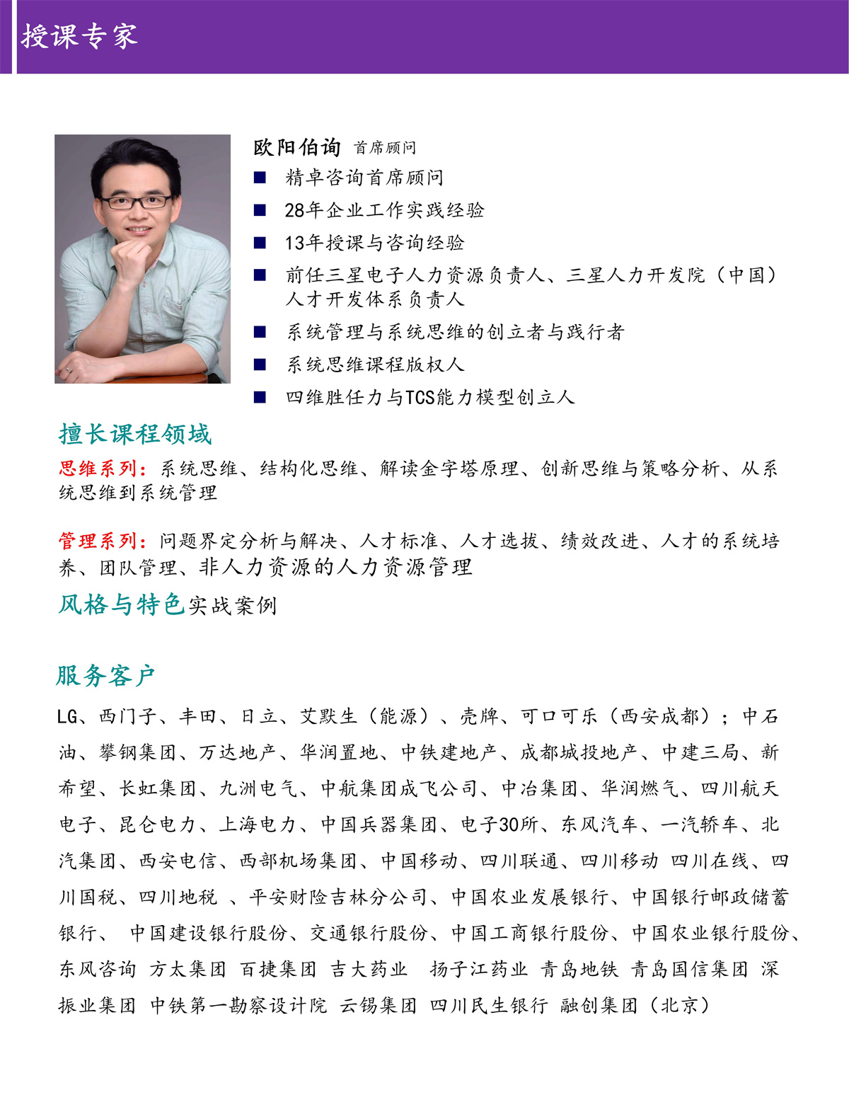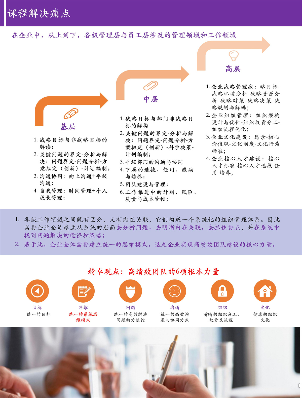 產品簡介:本課程核心價值在于所建立的系統(tǒng)管理模式可以幫助企業(yè)高層掌握企業(yè)運營的內在規(guī)律,明確企業(yè)走向優(yōu)秀與卓越的關鍵路徑與實現(xiàn)方法,架構全面的系統(tǒng)管理基礎,從而持續(xù)推進企業(yè)管理實現(xiàn)本質變革與突破;